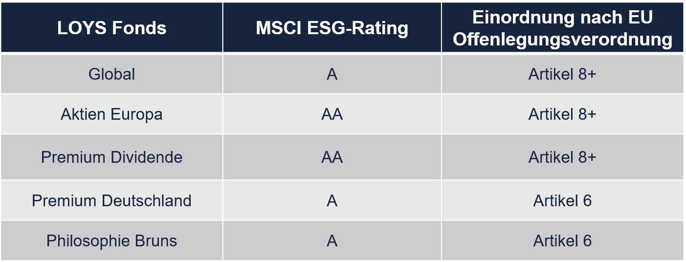 Die Anlagephilosophie der LOYS AG fokussiert seit Gründung auf Unternehmen, die profitabel und nachhaltig wirtschaften. Neben der quantitativ fundamentalen Bewertung des Unternehmens ist ein weiterer wichtiger Aspekt die Qualität des Managements und des Geschäftsmodells. Zu den betrachteten Risikoquellen zählen jedoch auch ökologische und soziale Faktoren, die einen zunehmenden Einfluss auf die Unternehmensbewertung haben. Ihrer gesellschaftlichen Verantwortung als Unternehmen folgend, hat die LOYS AG im Jahr 2020 nicht nur die Prinzipien für verantwortliches Investieren des Umweltprogramms der Vereinten Nationen unterzeichnet, sondern auch messbare ESG-Kriterien formal in den Anlageprozess integriert, um zuverlässig Unternehmen zu meiden, deren Geschäftstätigkeit das Wohl von Mensch oder Umwelt dauerhaft nachteilig beeinträchtigt. Die Fonds LOYS Global, LOYS Aktien Europa und LOYS Premium Dividende werden dementsprechend als Artikel 8+ Fonds (nachhaltiger MiFID Zielmarkt) eingestuft. Das heißt, dass für diese Fonds eine strikte Ausschlussliste, sowie ein Mindestanteil von 20 % nachhaltiger Investments gilt.