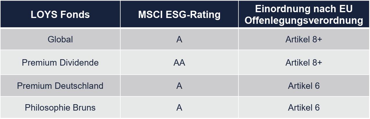 Die Anlagephilosophie der LOYS AG fokussiert seit Gründung auf Unternehmen, die profitabel und nachhaltig wirtschaften. Neben der quantitativ fundamentalen Bewertung des Unternehmens ist ein weiterer wichtiger Aspekt die Qualität des Managements und des Geschäftsmodells. Zu den betrachteten Risikoquellen zählen jedoch auch ökologische und soziale Faktoren, die einen zunehmenden Einfluss auf die Unternehmensbewertung haben. Ihrer gesellschaftlichen Verantwortung als Unternehmen folgend, hat die LOYS AG im Jahr 2020 nicht nur die Prinzipien für verantwortliches Investieren des Umweltprogramms der Vereinten Nationen unterzeichnet, sondern auch messbare ESG-Kriterien formal in den Anlageprozess integriert, um zuverlässig Unternehmen zu meiden, deren Geschäftstätigkeit das Wohl von Mensch oder Umwelt dauerhaft nachteilig beeinträchtigt. Die Fonds LOYS Global und LOYS Premium Dividende werden dementsprechend als Artikel 8+ Fonds (nachhaltiger MiFID Zielmarkt) eingestuft. Das heißt, dass für diese Fonds eine strikte Ausschlussliste, sowie ein Mindestanteil von 20 % nachhaltiger Investments gilt.