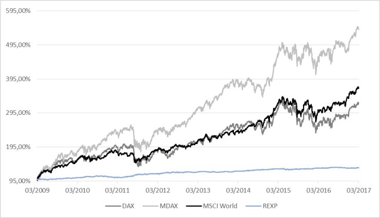 Wenige Anleger werden den Krisentiefpunkt des DAX als Einstiegsdatum erlebt haben und dennoch haben sich deutsche und erst recht weltweite Aktien in den letzten Jahrzehnten formidable entwickelt. Allein der MDAX, in welchem die mittelgroßen deutschen Unternehmen ihr zuhause finden, konnte trotz zwischenzeitlicher Krise seit dem Jahrtausendwechsel um stolze 467% (11,3% p.a.) zulegen. Der REXP, der in Deutschland die Wertentwicklung des seit Jahrzehnten haussierenden Anleihenmarktes misst, konnte im gleichen Zeitraum um fast 120% und damit um ca. 4,9% pro Jahr zulegen.