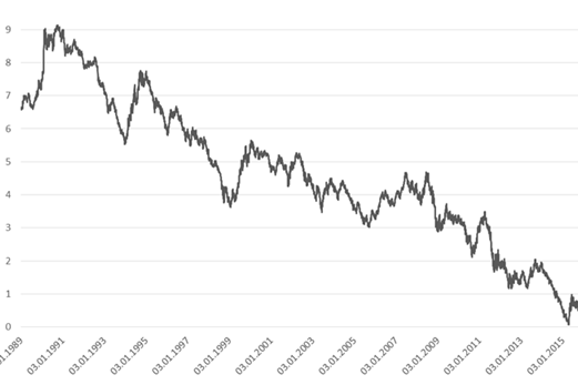 Unbestreitbar ist jedoch die Dauernullzinspolitik der Notenbanken hauptverantwortlich für den andauernden Aufschwung an den Eigenkapitalmärkten. Diese Entwicklung entbehrt nicht einer stringenten Logik, nach der Zinsanlagen schon immer den wichtigsten Wettbewerber für Aktienengagements darstellten. Je unattraktiver Zinsanlagen erscheinen desto interessanter sind Aktieninvestments et vice versa. Zinsen spielen für die Aktienmärkte aber nicht nur als Wettbewerber eine gewichtige Rolle, sondern üben auch einen direkten Einfluss auf die Gewinne der Unternehmen. Die meisten börsennotierten Unternehmen weisen Verschuldung in Form aufgenommener Bankkredite oder begebener Anleihen auf. Offenbar ist es vorteilhaft für die Wirtschaft, wenn Zinsen auf diese Schulden gering sind und fallen. Auch auf dem Gebiet der Aktienbewertung spielen Zinsen eine bedeutsame Rolle. Grundsätzlich gilt, dass Aktien um so höher zu bewerten sind, desto niedriger die Zinsen ausfallen. Gezeigt werden kann dieser mathematische Zusammenhang unschwer, indem künftige erwartete Unternehmensgewinne mit einem hohen und ein anderes Mal mit einem niedrigen Zinssatz diskontiert werden. Sodann zeigt sich, dass die abgezinsten Gewinne der Zukunft heute höher liegen, je niedriger der Zinssatz liegt.