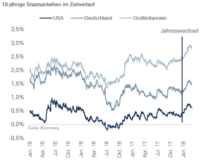 Von großer Bedeutung ist nunmehr die Frage, wie schnell und auf welches Niveau die Zinsen in den USA steigen werden. Von der Beantwortung dieser Frage wird abhängen, wie nervös die Aktienmärkte auf die Entwicklung reagieren. Ein sprunghafter Anstieg der Zinsen könnte Unruhe an die Märkte bringen. Daran kann der Notenbank und der Regierung nicht gelegen sein. Zudem werden steigende Zinsen Konsequenzen für den Immobilienmarkt und die Kreditvergabe aufweisen. In den USA, wo nahezu alle höherwertigen Wirtschaftsgüter finanziert werden, spielt dieser Faktor eine herausgehobene Rolle. Zwar läuft die amerikanische Konjunktur derzeit ganz passabel und am Arbeitsmarkt spricht man von Vollbeschäftigung; allerdings könnten höhere Zinsen den kreditfinanzierten Konsum ins Stottern bringen. Daran wird auch die im Dezember verabschiedete Steuerreform, die vornehmlich eine Unternehmenssteuerreform war, nur wenig ändern. Klar ist aber, dass die US-Notenbank für das laufende Jahr drei Zinserhöhungsschritte angekündigt hat.