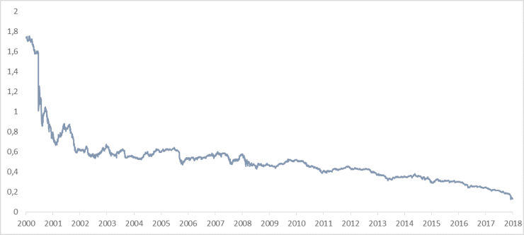 Stellt man die TRY-Entwicklung in einen langfristigen Kontext, dann zeigt sich, dass die Landeswährung der Türkei am Ende des Jahres 2000 bei knapp 0,70 Lira pro Euro und zehn Jahre später zum Ultimo 2010 bei 2,05 lag. Wie in nahezu allen Schwellenländern (brasilianischer Real, russischer Rubel, indische Rupie etc.) sieht man solche oder ähnliche Abwärtsentwicklungen der Währung.